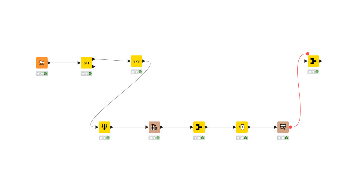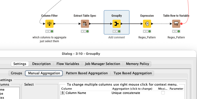 First you select the columns you want to aggregate and create a string that contains the column names separated by comma and blank with Group By Node: