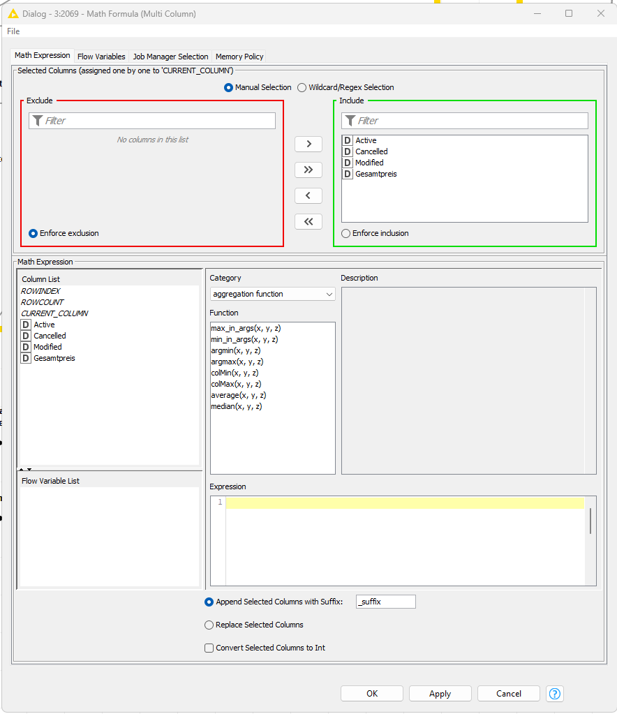maybe I missed something but it appears the sum function is missing in the Math Formula (Multi Column) node. Adding it would be a complementary / addition to the GroupBy and help starters to use Knime.