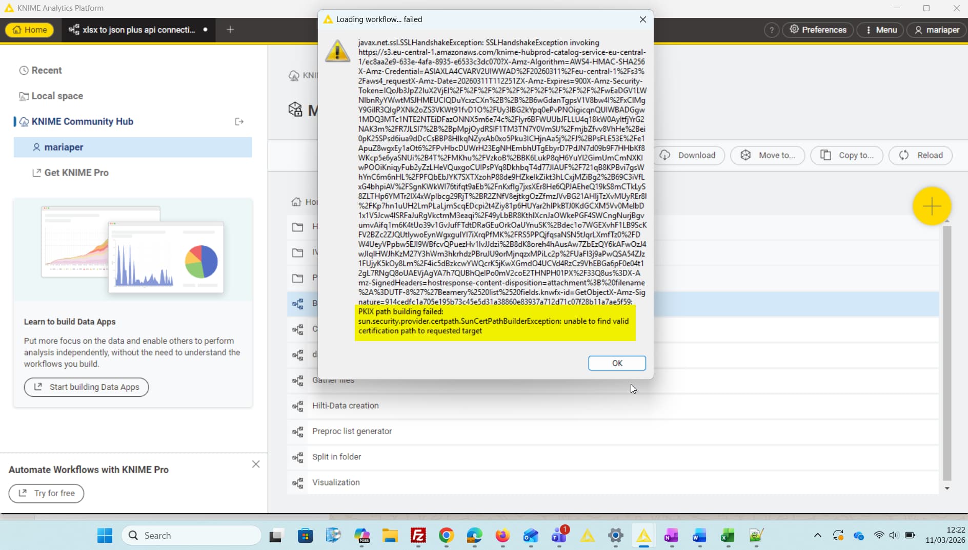 Hi @Mariaper, this looks like an issue with your internal company network. Please confirm with your IT whether KNIME Analytics Platform is allowed to make calls to Amazon S3; if it’s not allowed, ask them to enable it.