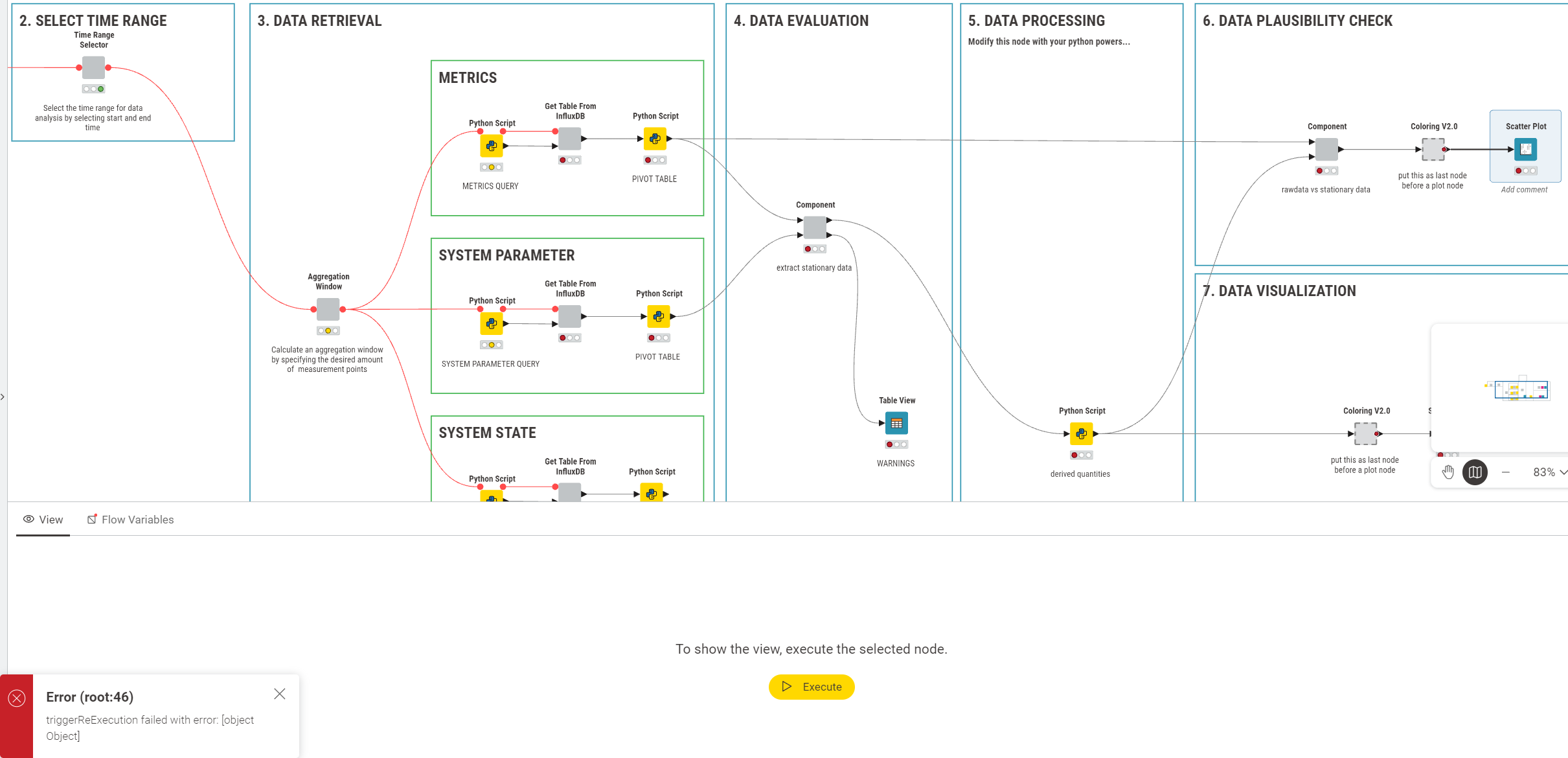There is a popup in the bottom left: Error (root:46) and errors ‘backpropagation’ until the Query Python nodes. It states that some triggered execution failed but until i want to open the view node, every node is showing green lights.