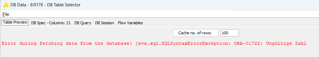 It could be that the query you are generating with KNIME needs to have single quotes put round a numeric value, but you’d need to give more information and show us the actual query. Unfortunately Oracle is not very forthcoming about the specific row of data causing the problem, or even the column which is frustrating. I’ve been there many times!