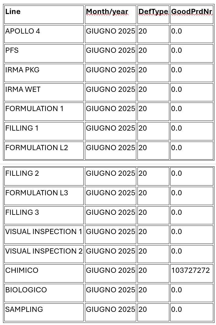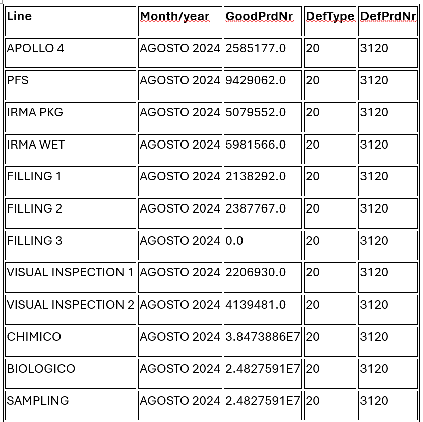 maybe someone can help me with my problem. In an industrial farm 10 lines produce an certain amount of finished goods and a certain amount of defective products. The defects are categorized in about 20 types. I have collected for each month in 2024 the total amount of good products and the amount of products with defects. Here is an example for August 24