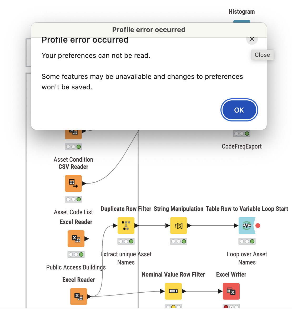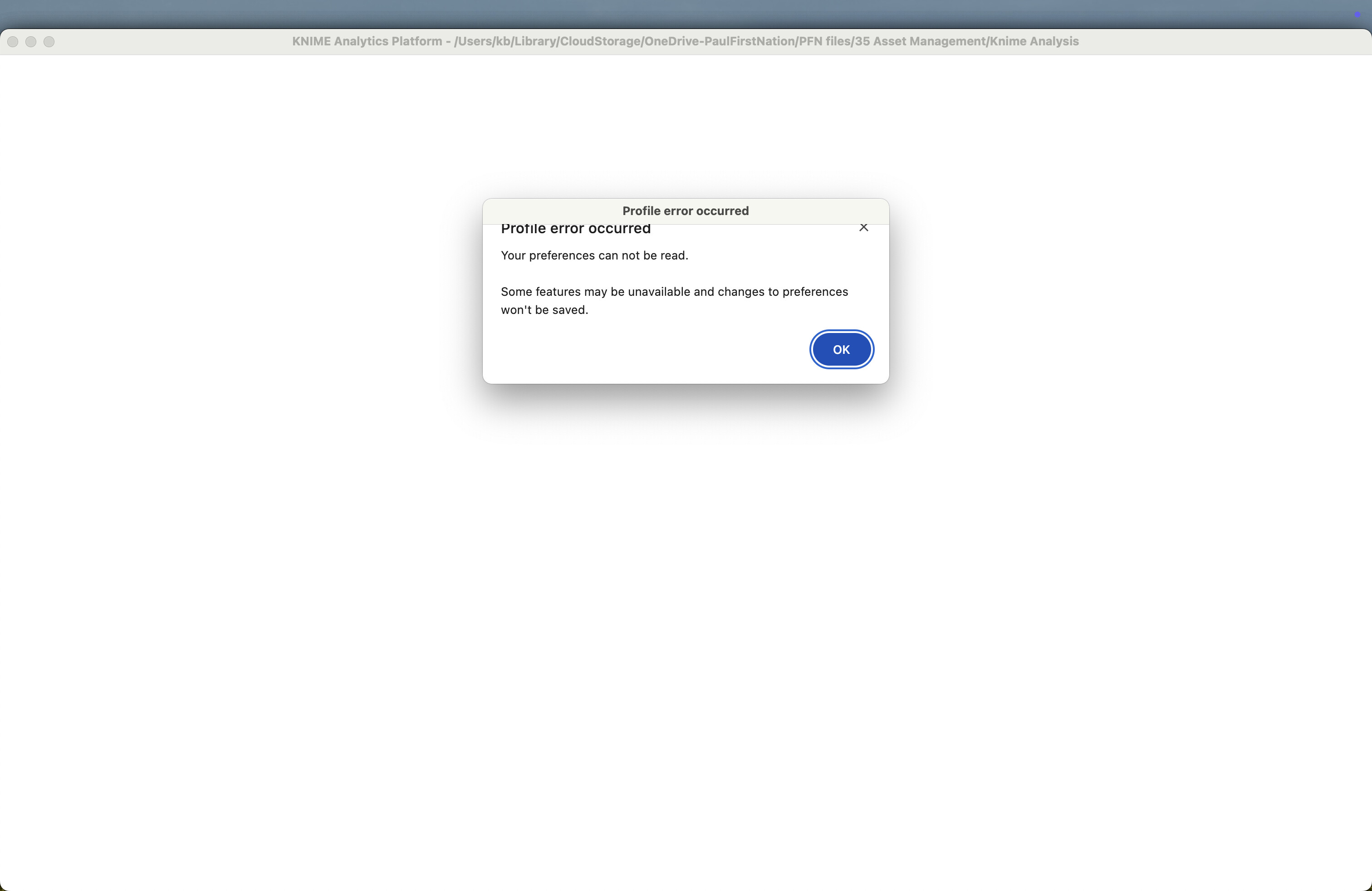 I’m a total NOOB to Knime and got the message: “Profile error occurred, Your preferences cannot be read.” Clicking OK or close makes the software crash while I can see the workflow I was working on tantalizing close behind the error message.