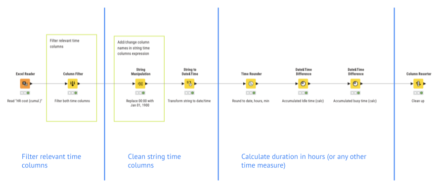 After reading the file and filtering all relevant time columns, the ones with type “string” get cleaned up by replacing the 00:00 with the Jan 1, 1900 date before they get transformed into the date/time date.