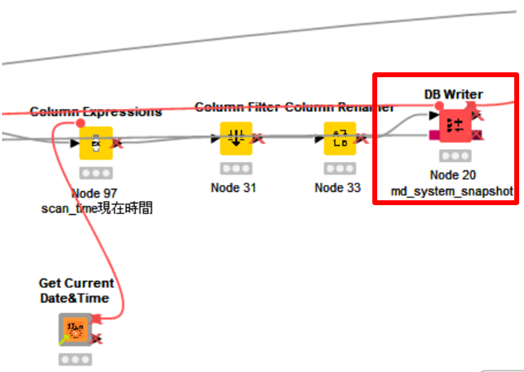 After the DB Writer, creating a new Microsoft SQL Server Connector to re-read the database table, then continuing with the subsequent nodes.