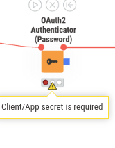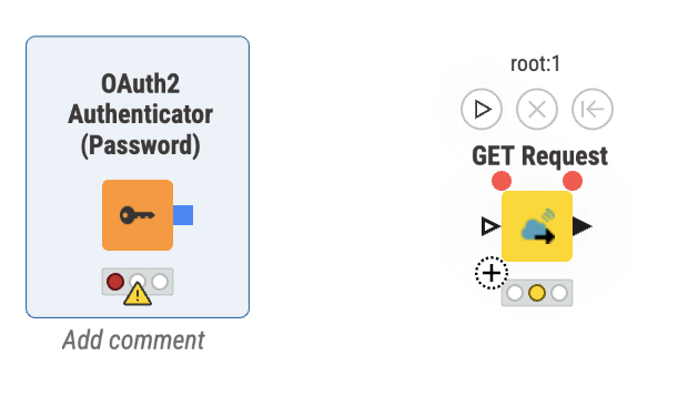 The blue output port of the Authenticator can be connected to the GET Request node. If you hover over the GET Request node, a little plus should appear in its lower left corner, an optional port. You can drag the blue square and let it fall on the lower corner, it should snap to the node and make the connection.