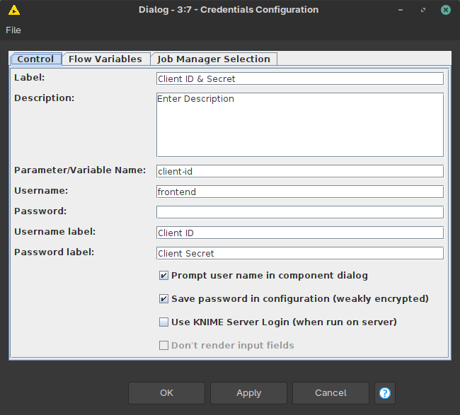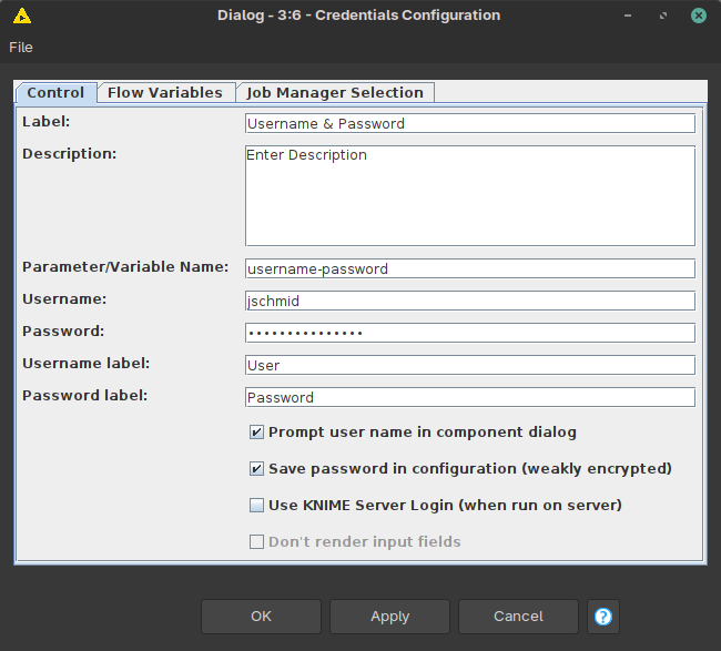 (As an aside: Configuration nodes are supposed to be used for Component building when you want to build “custom nodes” with simple dialogs. Then you don’t need to store your password/secret unsecurely and can input it before each execution of the workflow, but I would not worry about it for now)