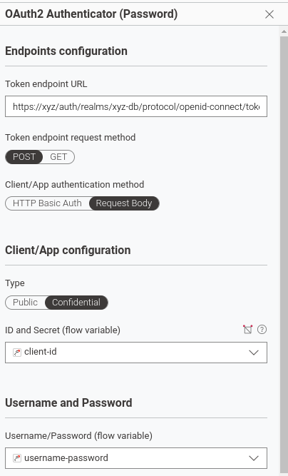 Here you can include a token (directly in the dialog “Token:”, also overridable via flow variable) or better use a Credentials flow variable that contains the JWT from the KeyCloak endpoint.