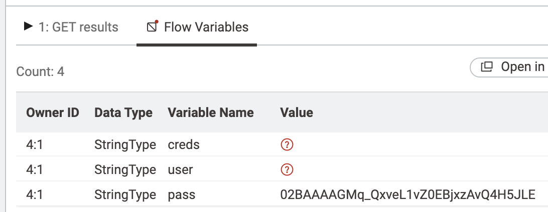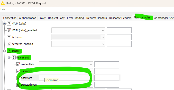 Ah, sorry, then I was not clear enough and assumed stuff. So the inverse of what I showed is true as well. I just put “test” into the “Token:” input and it is output as my “pass” flow variable. This implies it needs to be set in the dropdown “Bearer → Bearer auth → password” (this old flow variable view is pretty much a view into the XML settings).