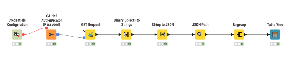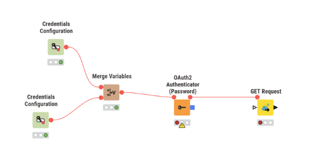The two Credentials Configuration nodes can be chained like the other nodes, so you don’t need the Merge Variables node. You put the Flow Variable output of the username/password onto the left upper “ear” of the next client-id/secret node. Then the Flow Variables of both nodes are available at the red output port.