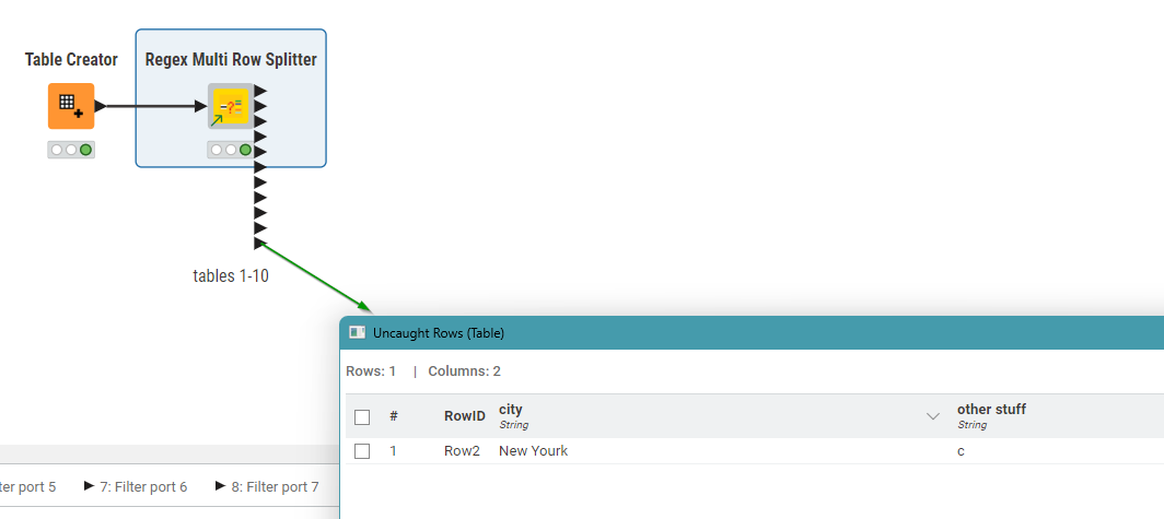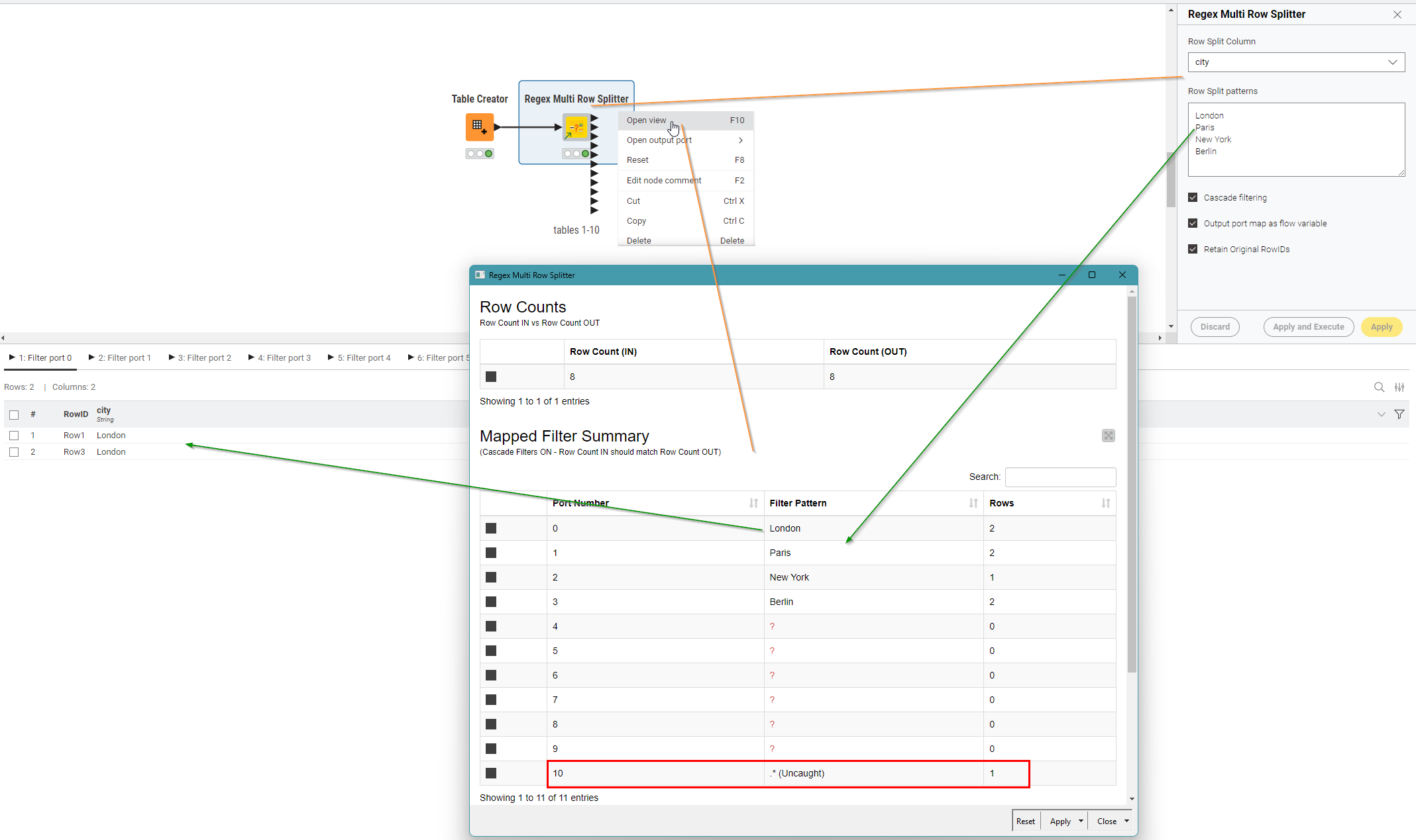 It also has a a view that tells you how many rows are caught by each filter pattern. In the demo screenshot below, you can see that my config has caught a number of different cities, but I can easily see on the view output that there is an uncaught row, so I can go look at the 11th output (port 10) and quickly see what I’ve missed