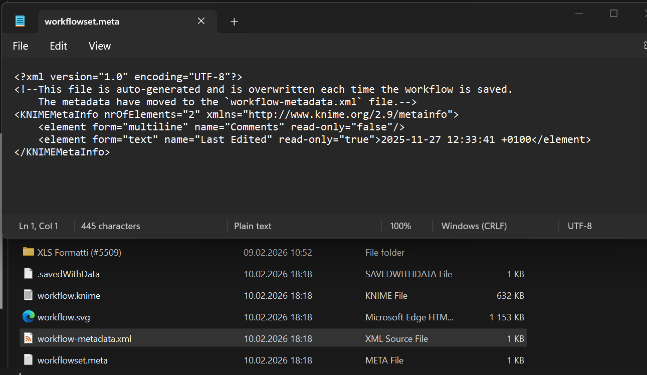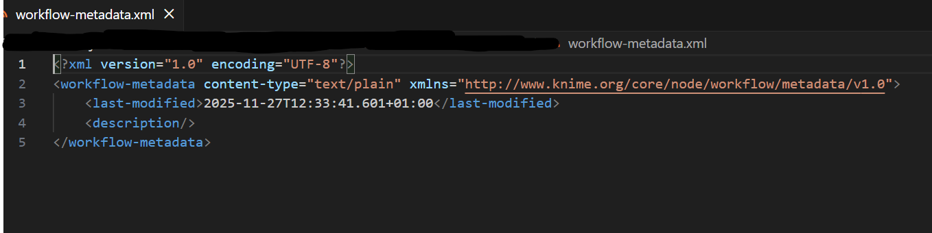 workflowset.meta and workflow-metadata.xml looks fine (screenshots below). workflow.knime looks really strange and those symbols don’t translate to anything.