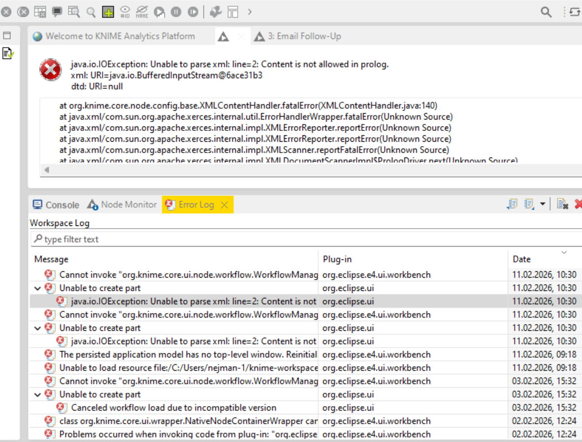 As in the topic, yesterday I closed Knime one workflow with one workflow open, and i chose not to save it as I didn’t make any changes (added and then removed one groupBy node to test something) and today the same workflow was corrupted with very simmilar message to this one: (photo of the previous error)