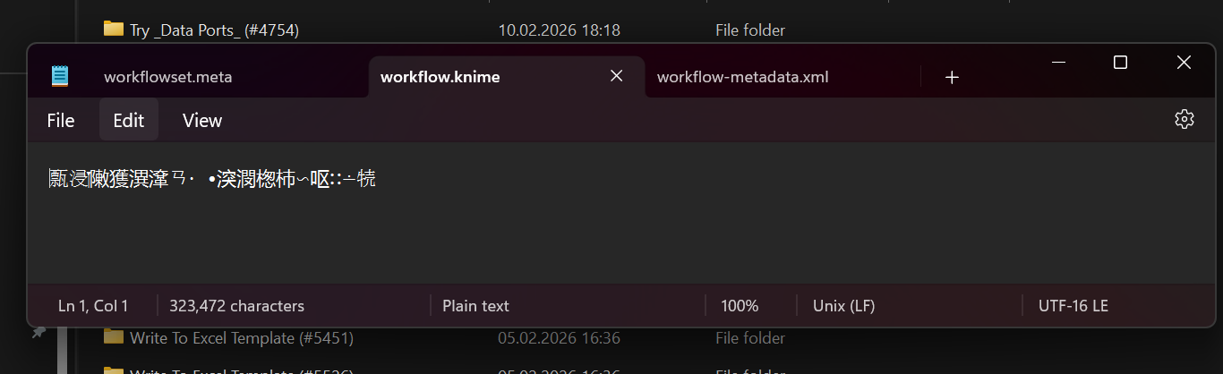 From the screenshot your workflow.knime seems to be opened as UTF-16 LE, while all other files are opened as expected as UTF-8. Could you re-open this file with UTF-8? Maybe it is more readable then and we can figure out what is wrong. According to the screenshots, the file is also comparatively large compared to the text that is visible. So it might just not show the whole contents, since they don’t currently decode to visible characters. Maybe opening with a Hex Editor can also help to see if the data is recoverable. It could be that just the first couple of bytes are wrong and the rest is still there.