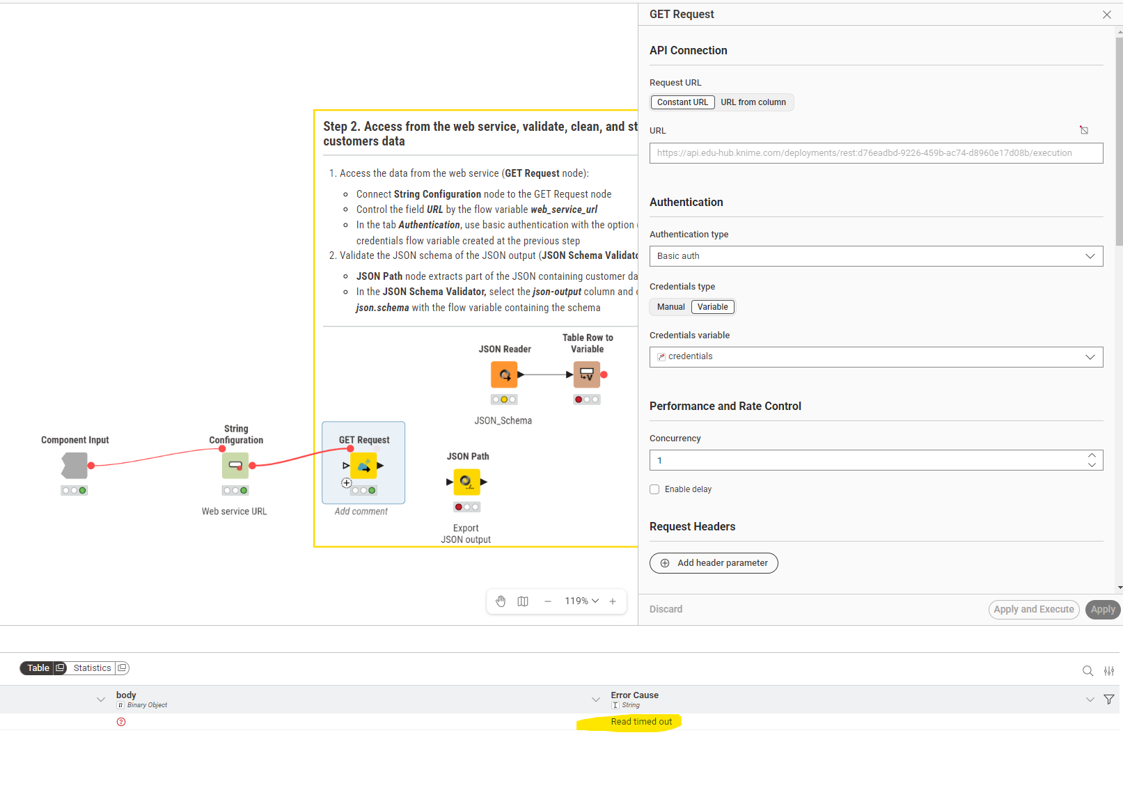 Hi all, I have a problem with the “GET Request” in Step 2. I configured the Web Service URL, connected the String Configuration, and configured the GET Request. But I get a “Read Timeout” every single time.