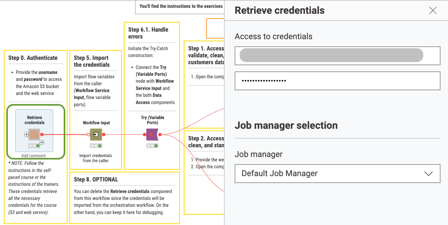 Sometimes the issue arises from the confusion between configuration of the component (this would be the right place to provide credentials) or of the nodes inside the component (in this exercise you don’t need to open the component).
