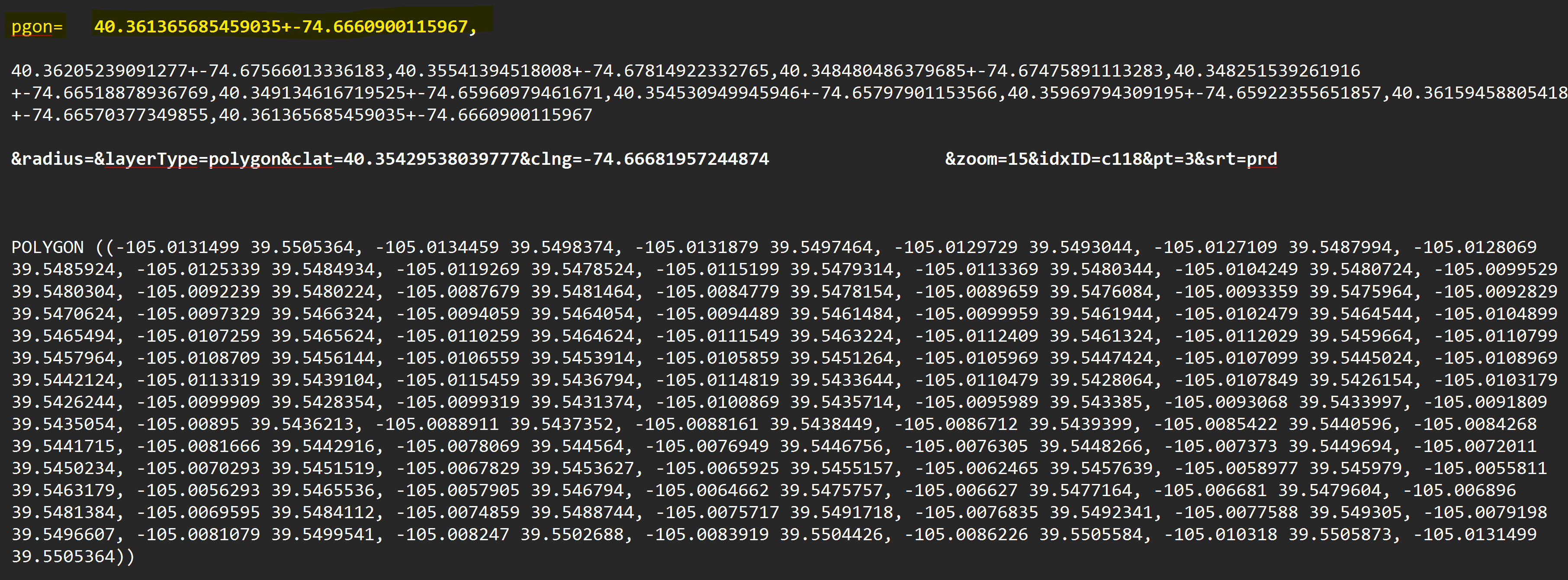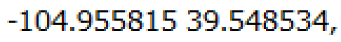 The system provides the standard WKT format “-105.0125339 39.5484934,” etc. I’m used to this format and it’s what google maps provides from my hand-drawn polygons.
