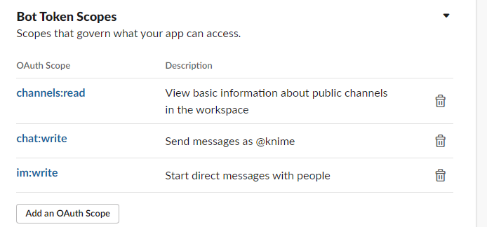 I just deleted all my scopes waited a bit for this to process and started from scratch. To run this node on my Slack workspace the only scopes I need to have active are (the other nodes are the reason we need additional scopes):