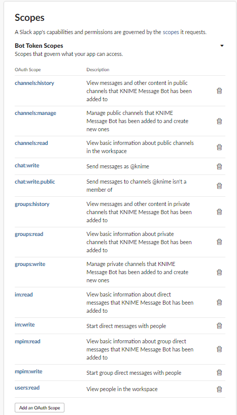Ok, here we go again. I have updated the slack api dependencies to the latest official release.It now appears that the user oauth token is not required as all nodes function on the bot oauth token. So you only need to use a user token and scopes if you want to let KNIME impersonate you.