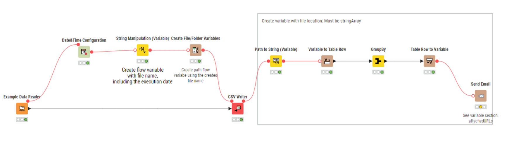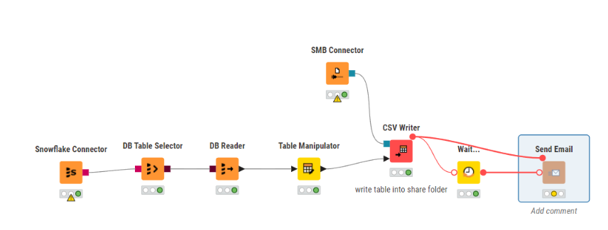 I have this pretty simple workflow that is reading some table from snowflake, saving it into a share folder and sending and email with this file attached.