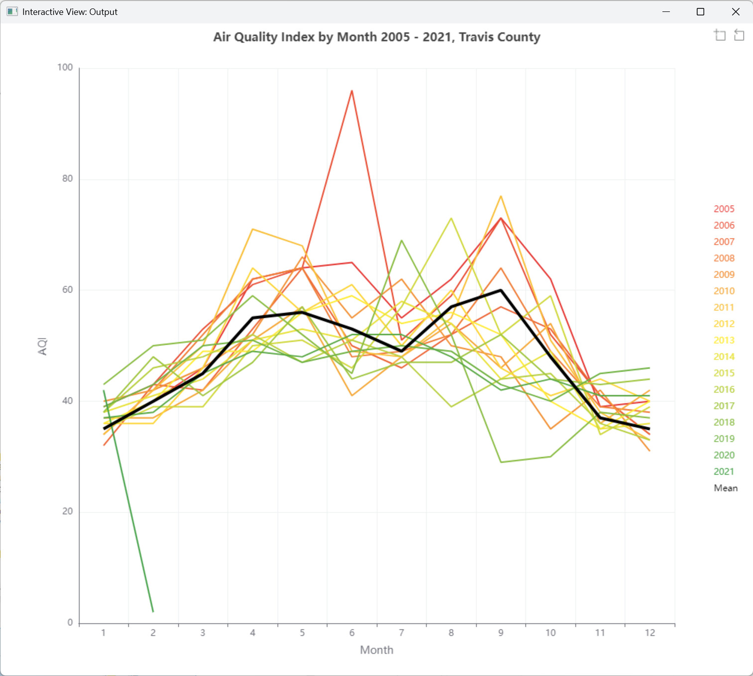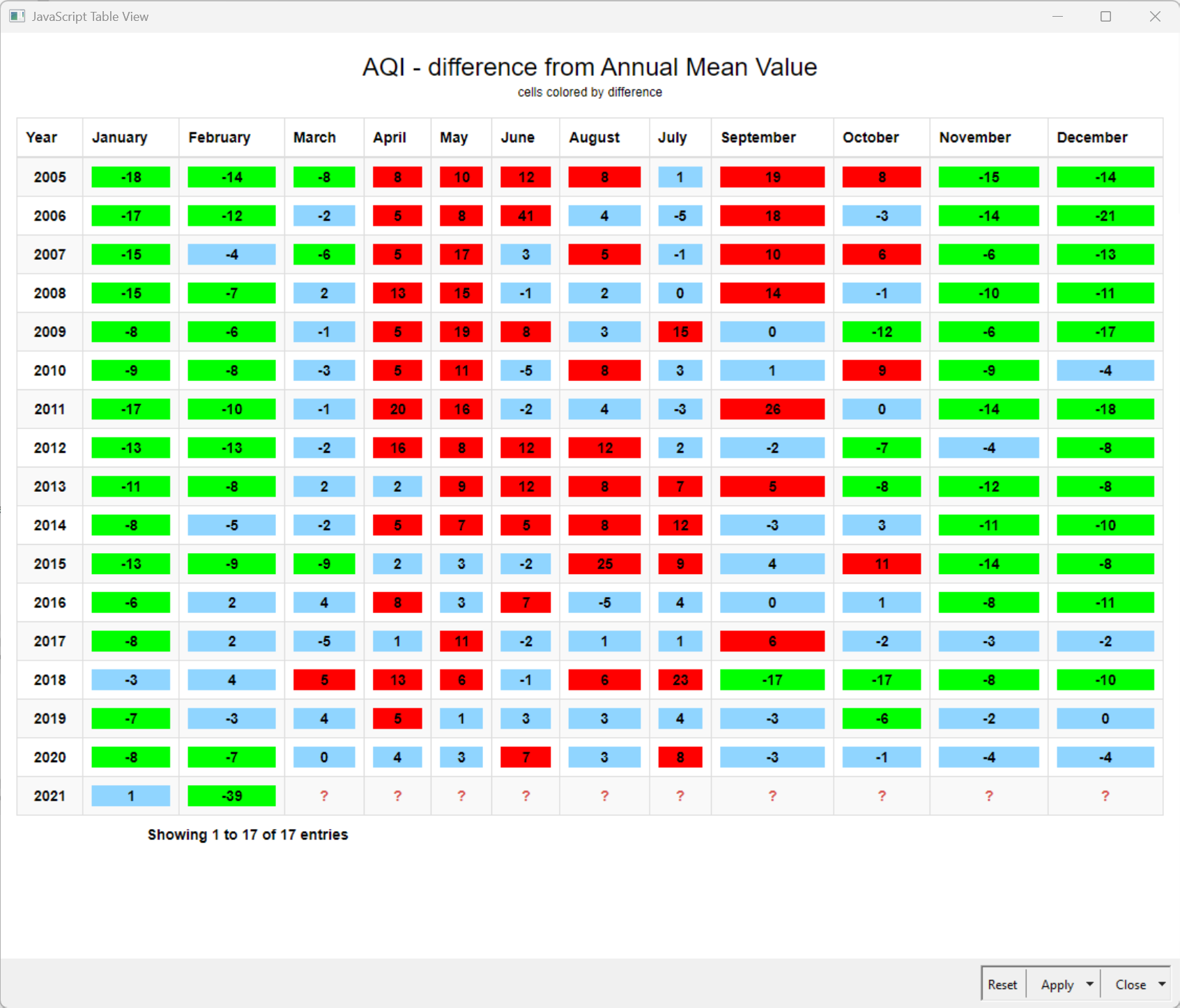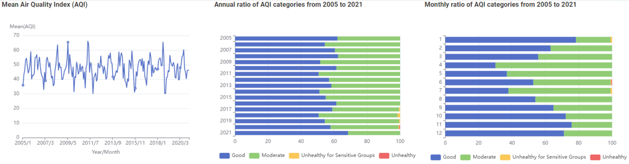 A quick dashboard to show the average AQI per month compared to average AQI per year. And the table with months higher than year.