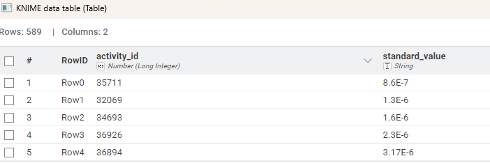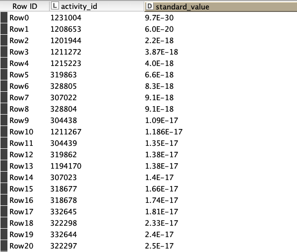 From the schema (PRAGMA table_info(activities);), the column is defined as: 6|standard_value|NUMERIC|0||0.