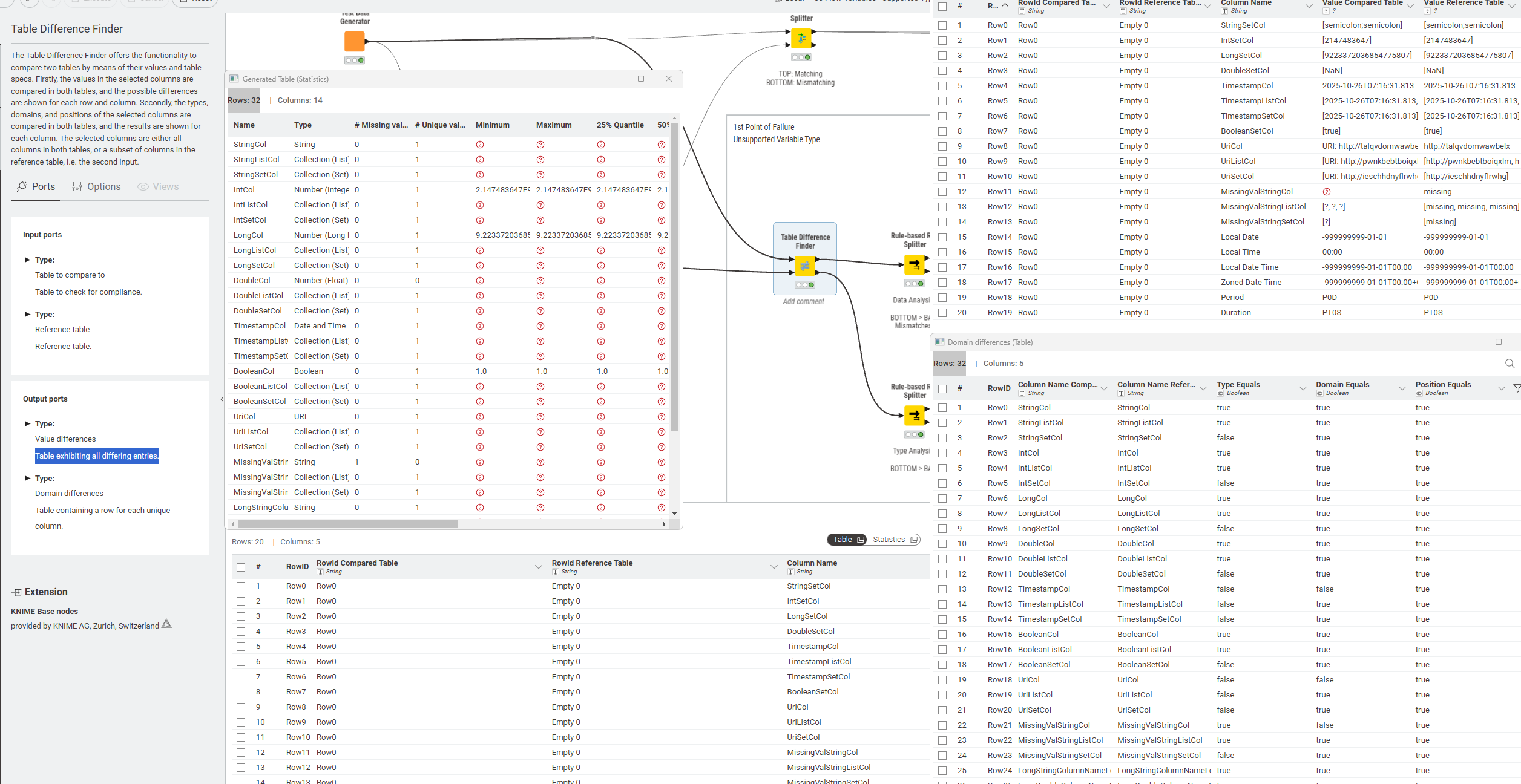 the Table Difference Finder outputs all columns in the second output but only mismatching values from the first.