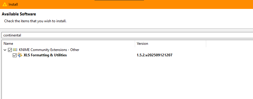 Thanks for the detailed instructions @takbb! I just tried and confirmed that I can now find XLS Formatting & Utilities by searching for continental in KNIME Community Extensions - Other (latest - not just 5.4). It didn’t work a few days ago when I posted this, but I’m glad that it’s now working!