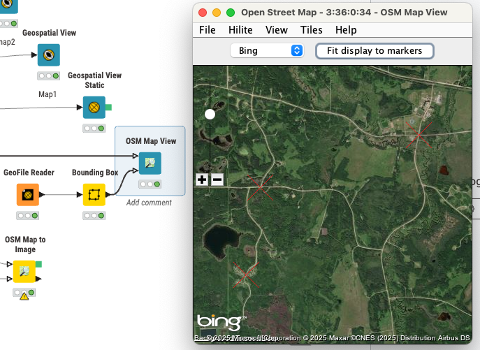 Looking for another approach I tried using OpenStreet Map, “OSM Map View” which oddly enough provides BING satellite images. Unlike “Geospatial View” the outcome map is not centered on the selected geolocations in the spreadsheet.