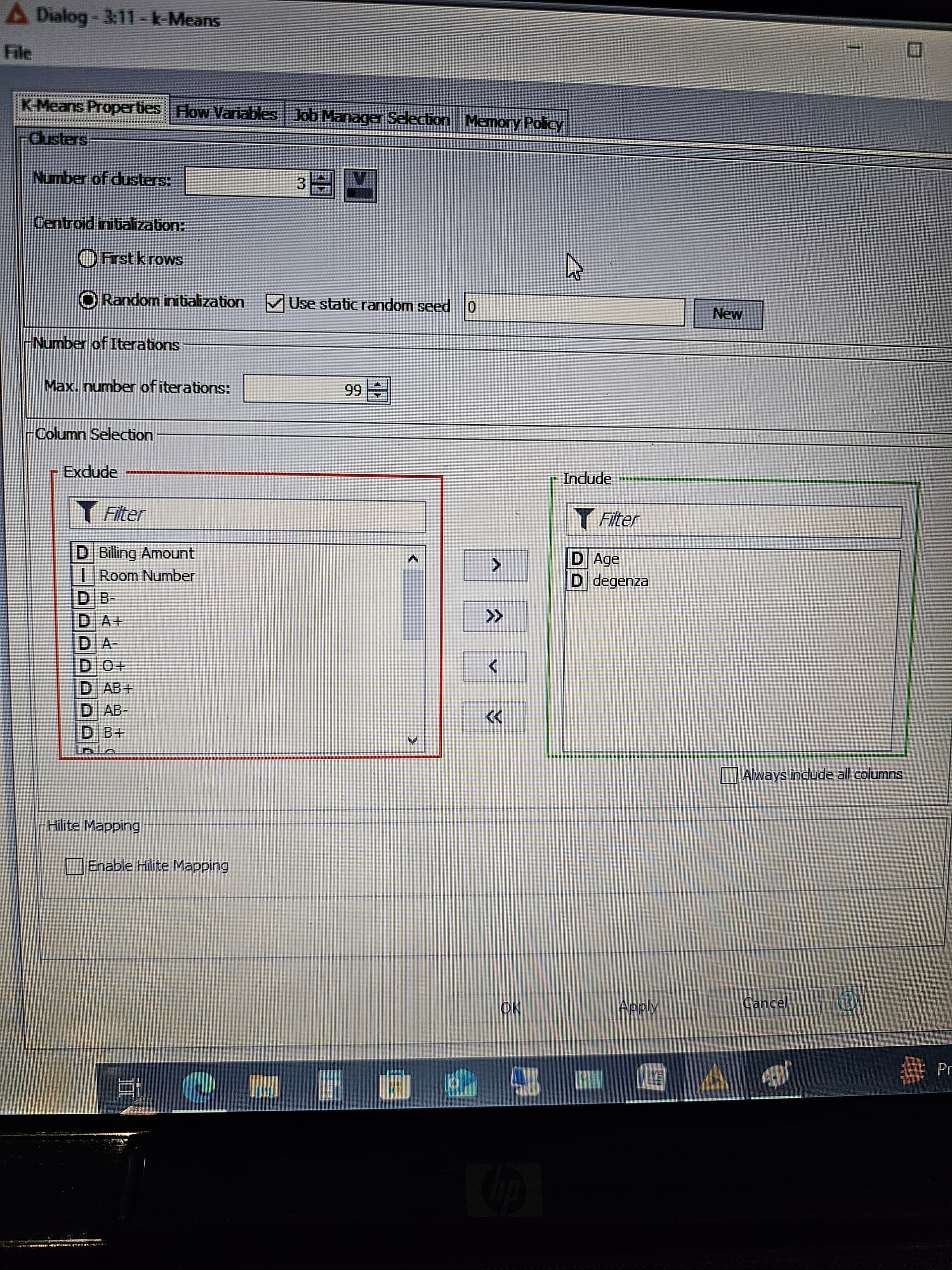 Grazie mille. Ora proverò a migliorare il workflow anche perché non riesco ad interpretare i cluster.(il dataset riguarda i dati dei ricoveri ospedalieri con patologia, data di ricovero e dimissione, farmaco utilizzato, età e sesso polizza assicurativa, ospedalee medico curante)