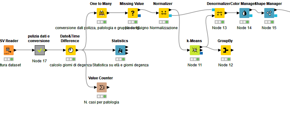 Buongiorno a tutti. sono alle prime armi con Knime e sto cercando di creare un workflow partendo da un dataset che riguarda i ricoveri ospedalieri (genere, patologia, gruppo sanguigno, dati di ricovero e dimissione) e con k-means vorrei individuare i cluster al fine di riportare graficamente alcuni risultati (es. relazione tra patologia con giorni di degenza o patologia rapportata all’età).