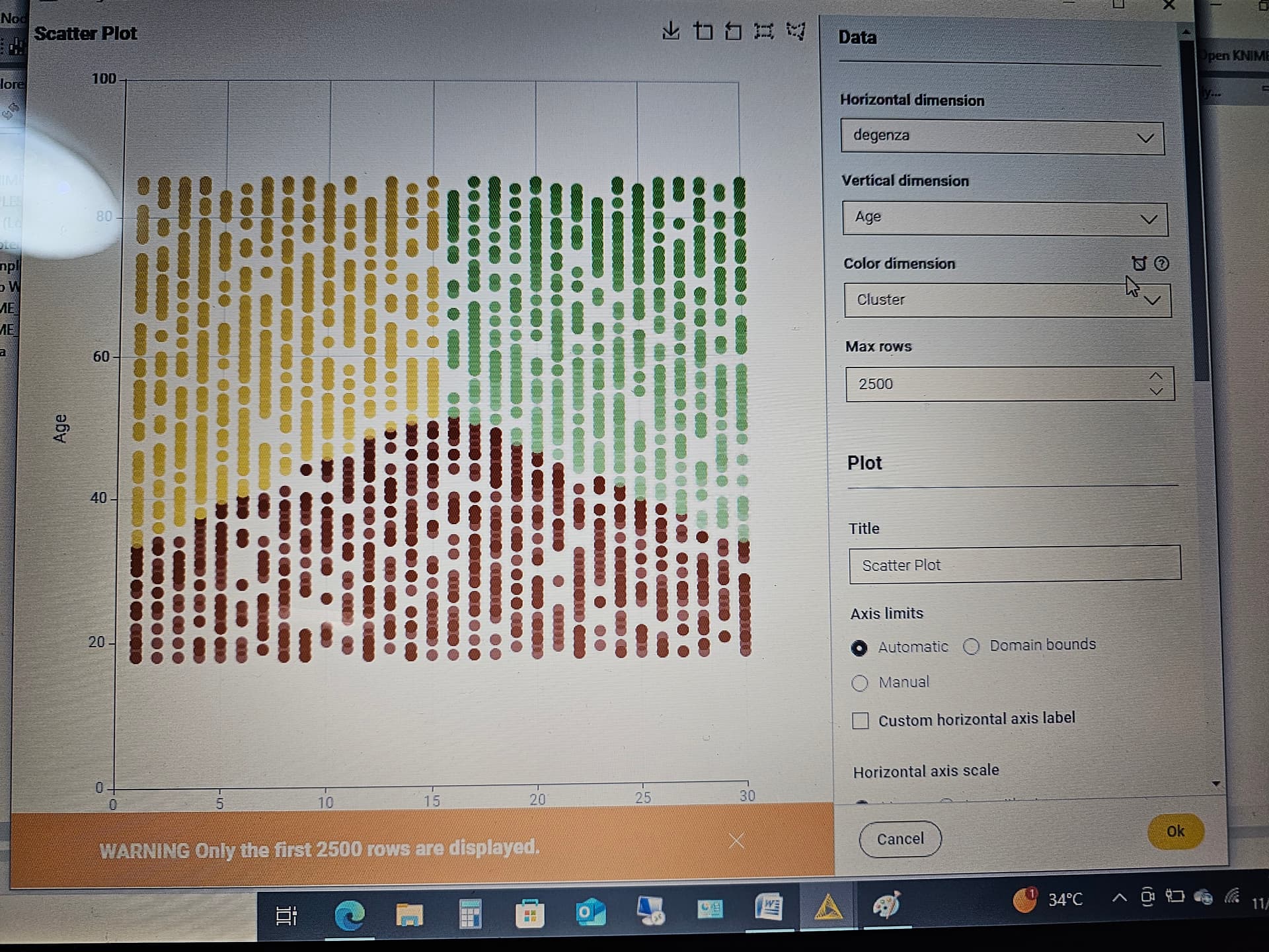 Sì, mi pare coerente, anche perché stai utilizzando solo due features. Ci sono altre features numeriche, o che possono diventare tali utilizzando il nodo category to number? Proverei ad aggiungerle. Ad esempio, utilizzando il genere potrebbe uscire fuori una clusterizzazione differente. In questo caso potresti adoperare, per la rappresentazione, il nodo scatter plot 3D.