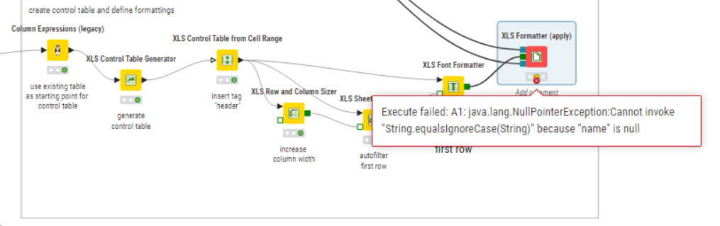I am facing “Execute failed: A1: java.lang.NullPointerException:Cannot invoke “String.equalsIgnoreCase(String)” because “name” is null” issue for few XLS node like Front formater , background formater but few of the nodes are working fine line Column resize and filter to top row . I am not using any column named null . can some help me fix this ?